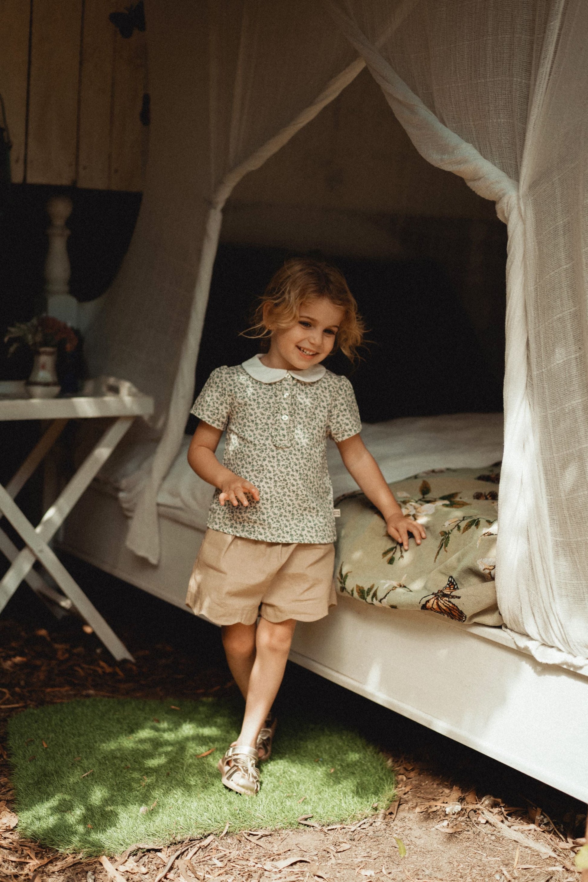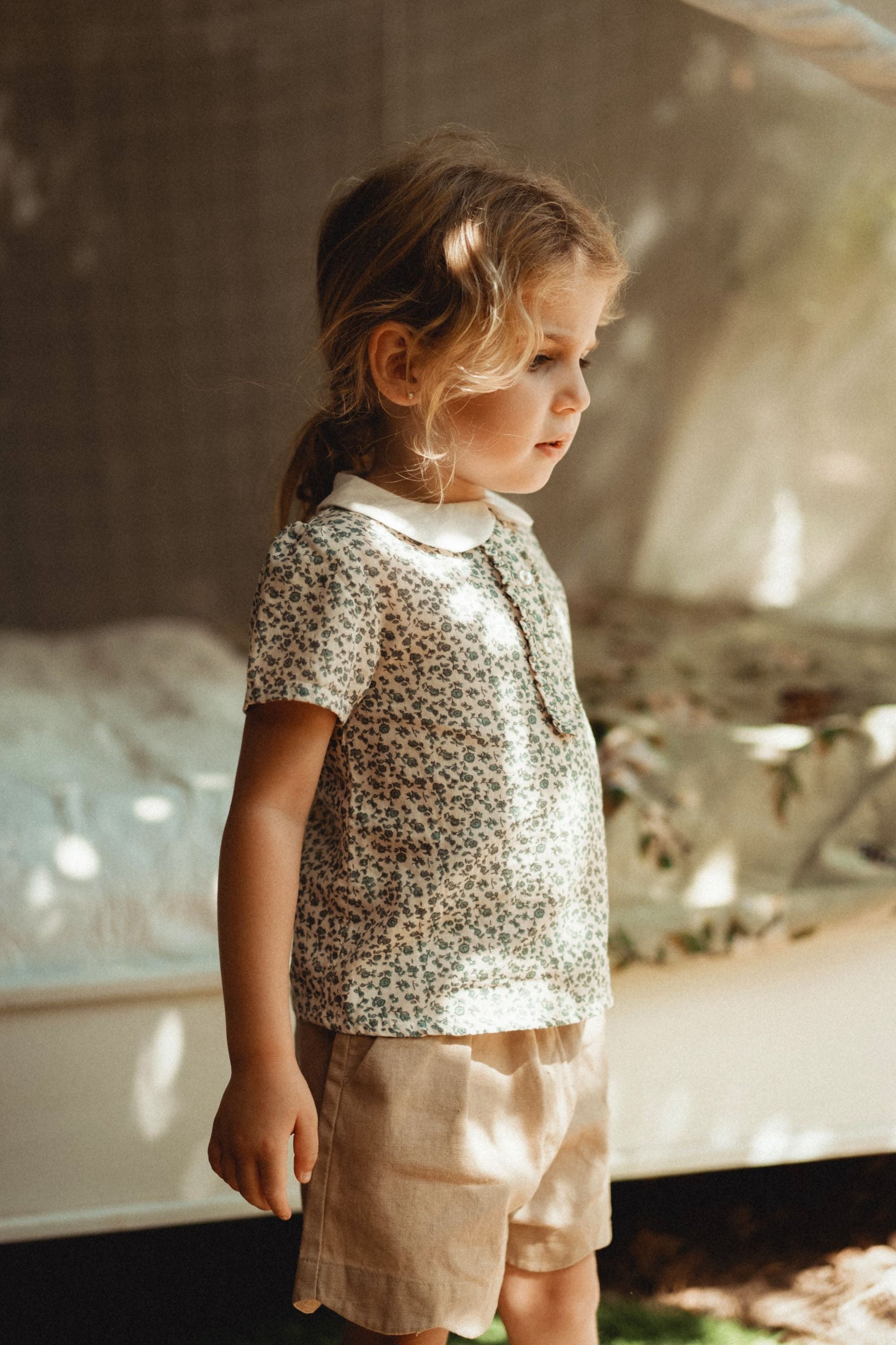 Transport your little princess to a world of vintage charm with our Full Print Doll Neck Top. Crafted from 100% premium long-staple cotton, it exudes a romantic essence inspired by nature's beauty. The relaxed summer fit ensures cool comfort, while the retro blue floral print adds a touch of whimsy. With delicate details like the ruffle neckline and sweet button closure, it's both playful and elegant—a perfect addition to her summer wardrobe.